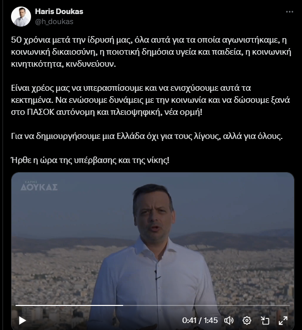 Το μήνυμα του Χαρη Δούκα για τα 50 χρονια του ΠΑΣΟΚ ήταν σαφές και εκφράστηκε με ενα συγκινητικο video .